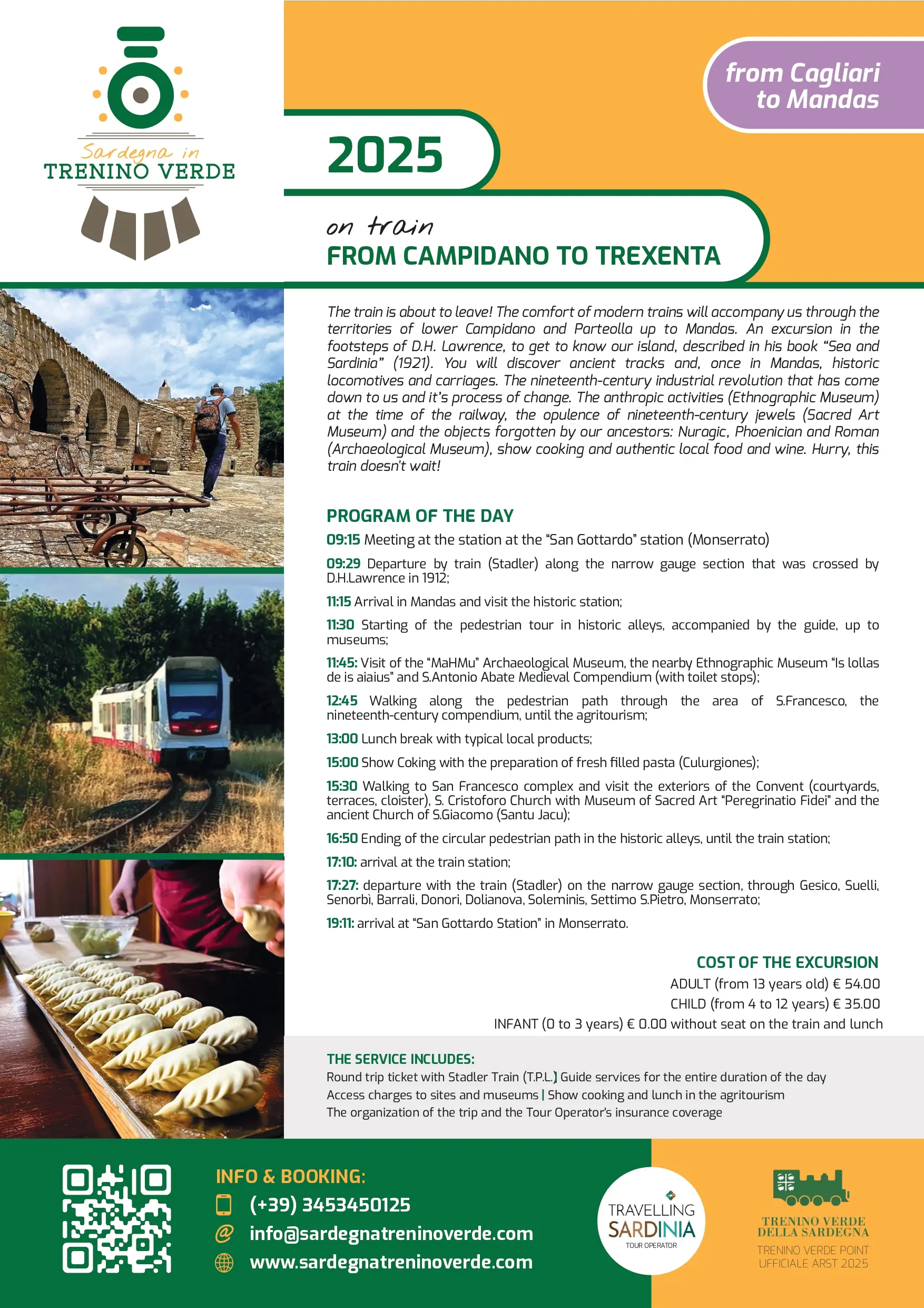 - Guide services (IT/EN) for the entire duration of the day (Train, Railway Station, Mandas pedestrian path, S. Francesco Convent and S. Giacomo Church);